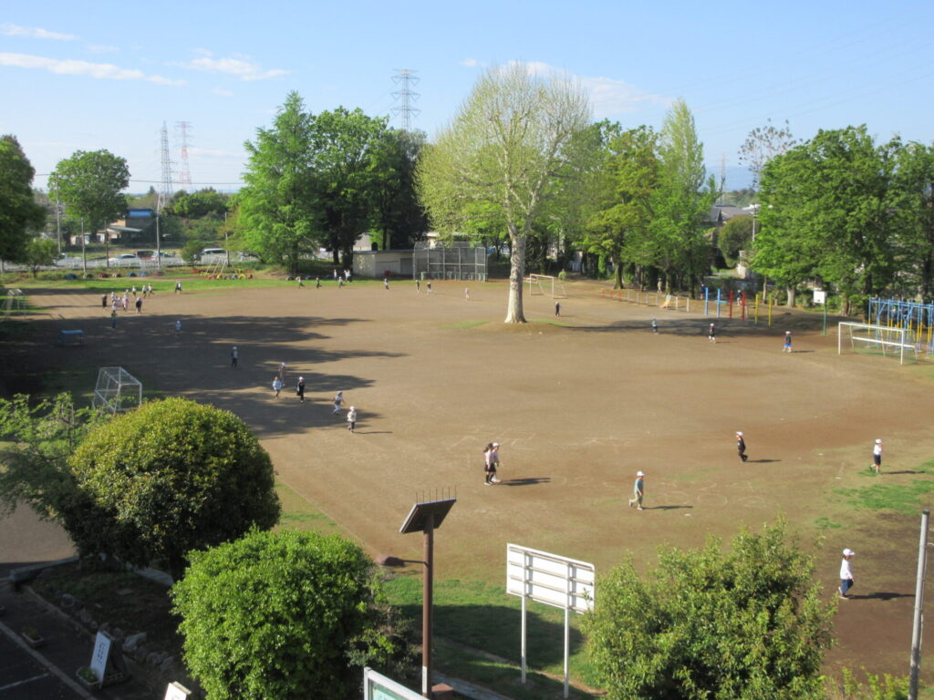 校庭では、たくさんの児童がマラソンに取り組んでいます。