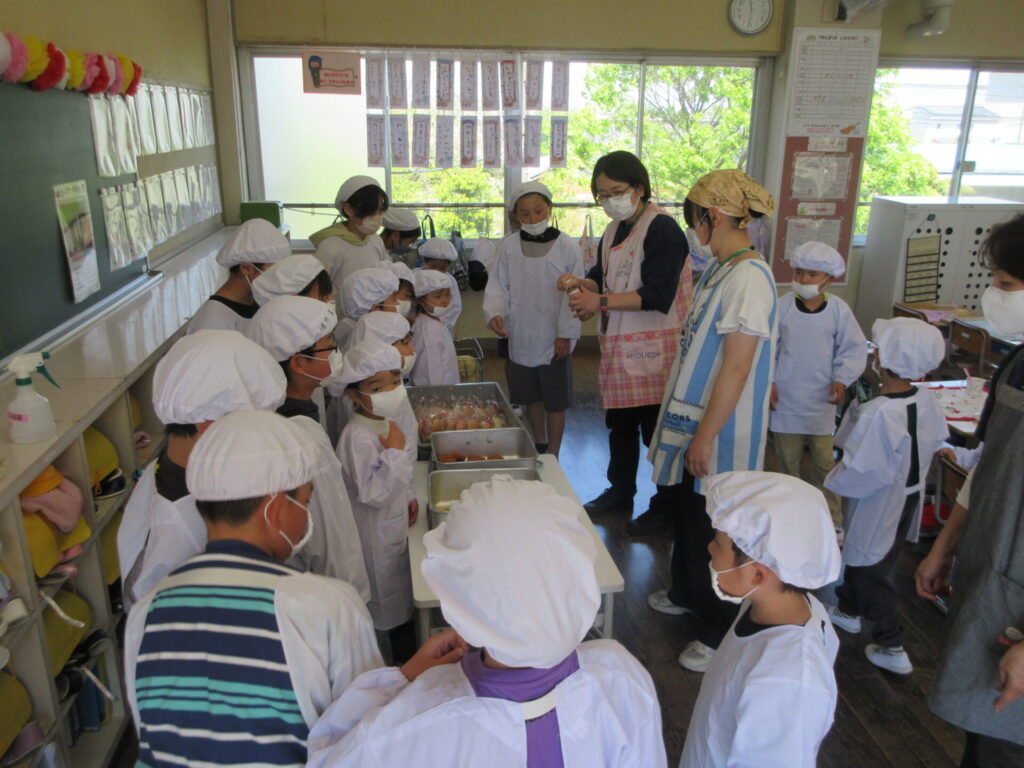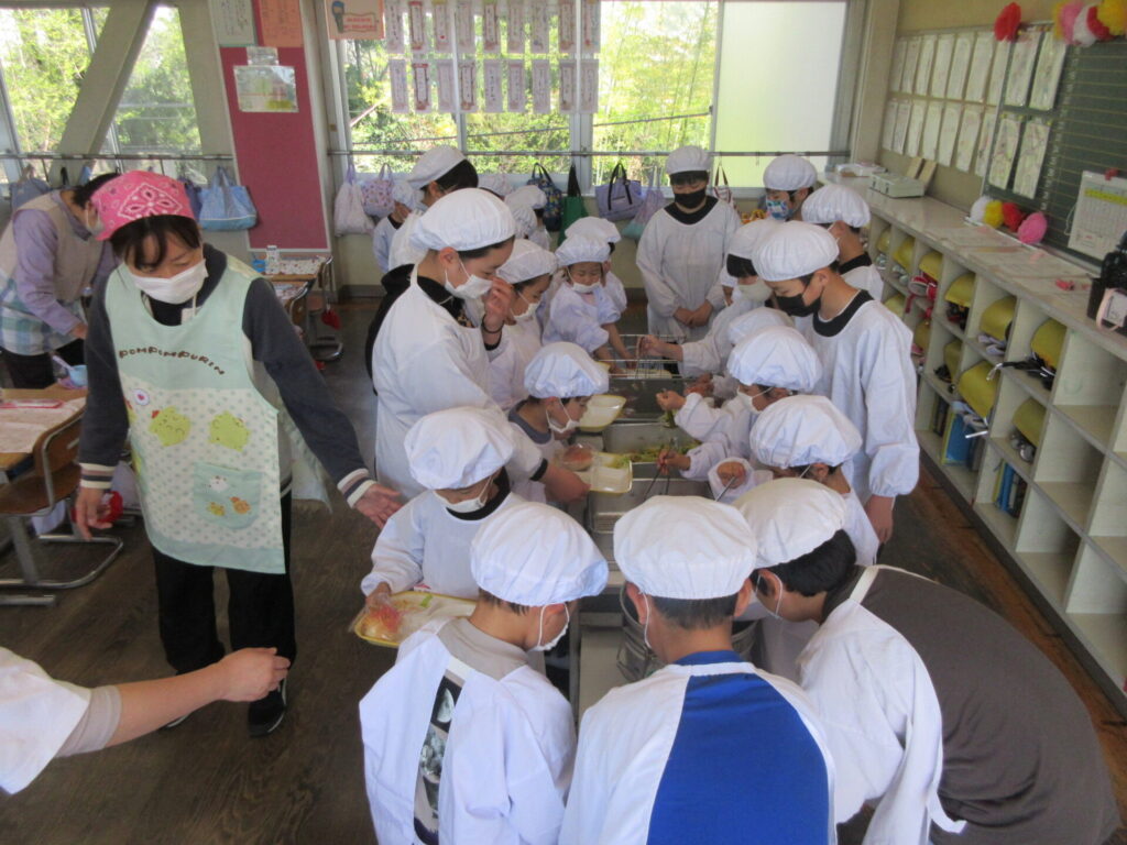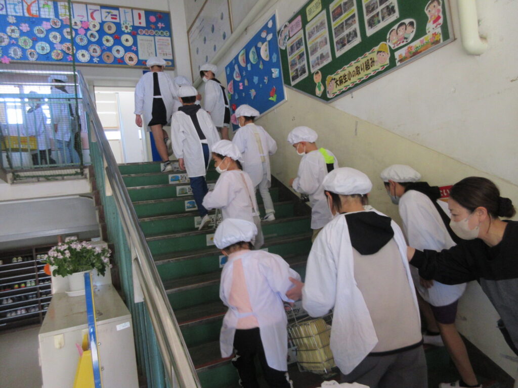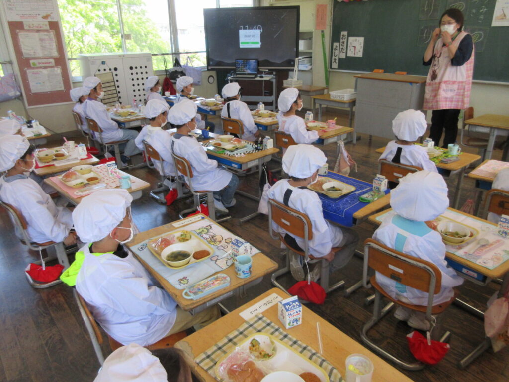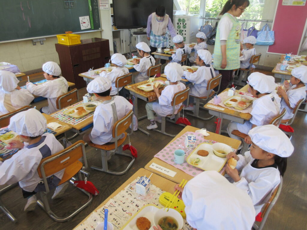 1年生は初めての給食がありました。6年生が配膳を手伝ってくれました。楽しみにしていた給食を、おいしくいただくことができました。