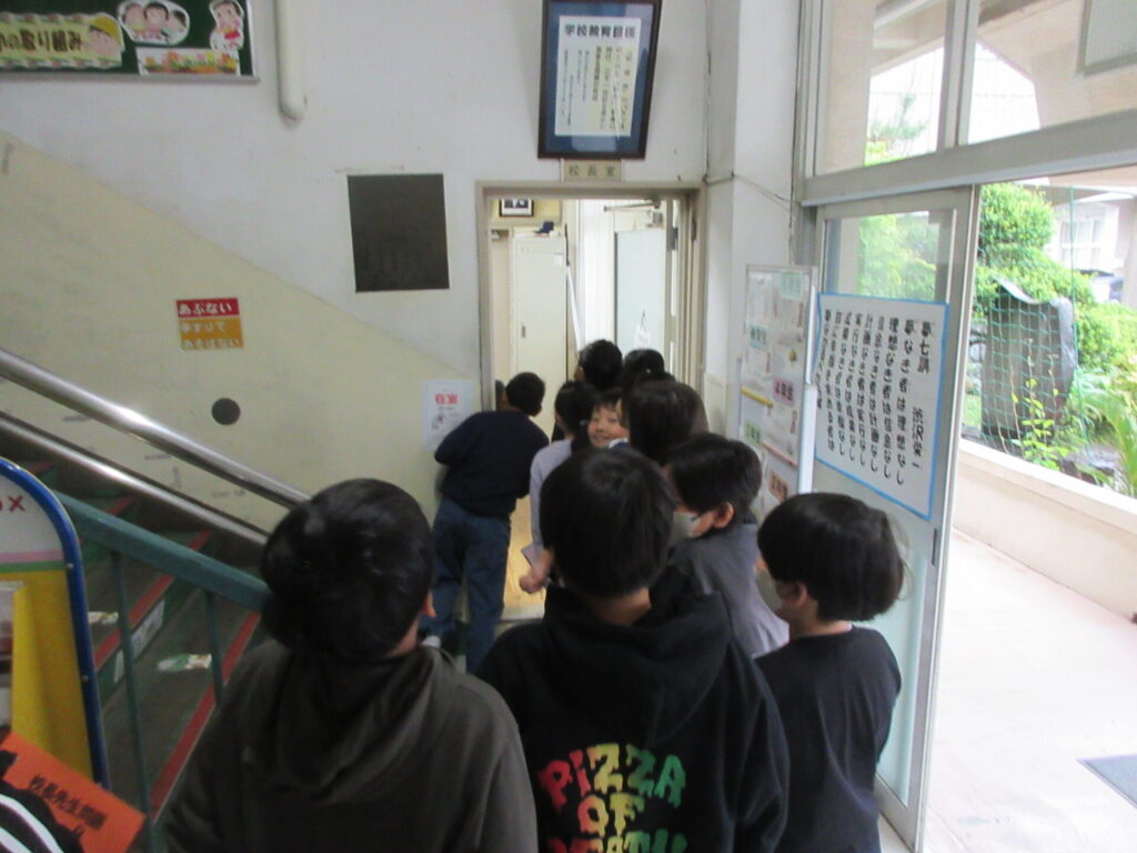 4/27(月)1年生の学校たんけん 2026年4月28日 最終更新日時 : 2026年4月28日 kumagaya_author 雨の月曜日でした。 1年生の学校たんけんがあり、2年生が手を引いて案内してくれていました。 休み時間には「校長先生問題」にチャレンジした児童が、校長室前に列をつくっています。