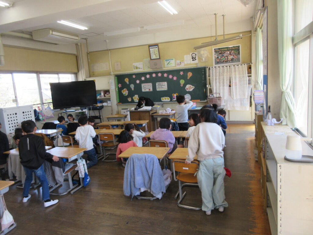 「新たな気持ちで登校しました。4年生では特に3つ頑張りたいです。1つは漢字一つ一つを得意にすることです。2つ目は、クラブが楽しみです。3つ目は、挨拶を自分からして、友達とのかかわりを大切にしたいです。また、困っている友達がいたら、一緒に考えたいです。頑張りたいことがたくさんあるので、4年生が楽しみです。」(4年生代表)